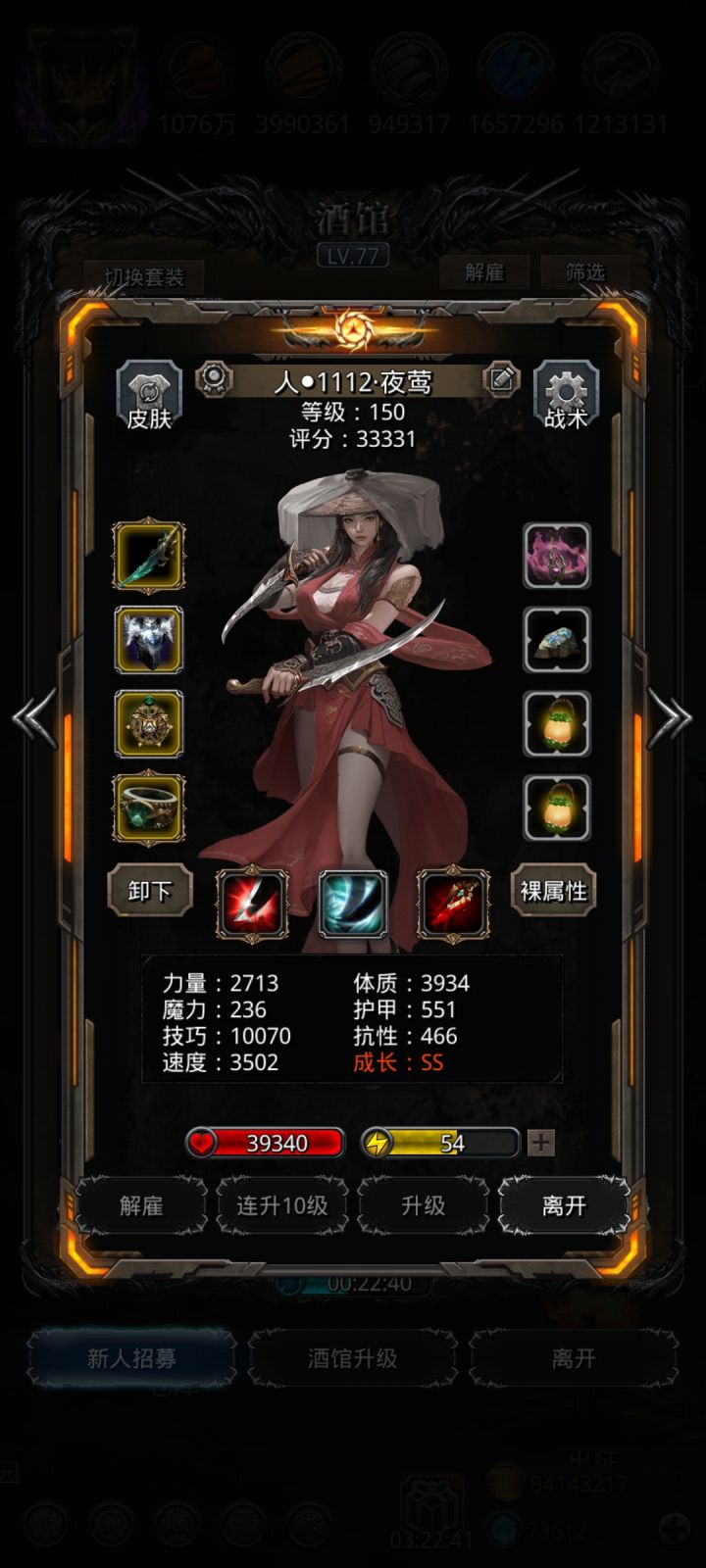 话说火法是真猛啊,垃圾环还没升满就超过蛮子了,蛮子要再强一点只有拿战鬼了吧,夜魇拿速技环应该还能提升一点,夜莺目前感觉比演豪要强,9级环就能抵得过剑豪满级环。天堂剑的概率懂得都懂,显示75实际上估计只有40。