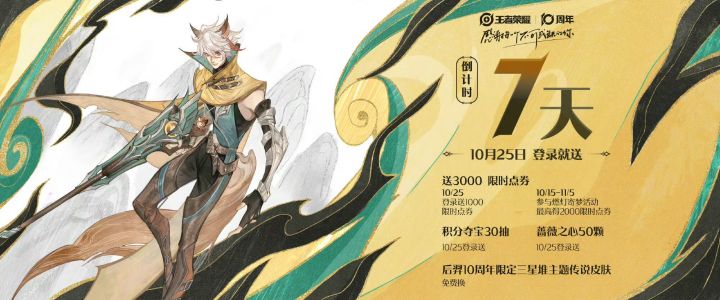 距1025王者十周年还有7天答应我,无论何时何地,都会遵守约定。温馨提示:10月25日,十周年庆!登录就送1000限时点券(十周年期间,参与活动最高得3000)、积分夺宝30抽、蔷薇之心50颗等豪华福利~