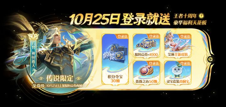 10月25日登录送1000限时点券,积分夺宝30抽等好礼10月25日,十周年庆!登录游戏即可领取限时点券x1000,积分夺宝抵扣券x30,灵宝套装-青铜宝,艾琳-鹤鸣心笺,蔷薇之心x50豪华福利。燃灯寄梦最高得2000限时点券活动时间:10月15日逐步开启-11月5日23:59活动入口:活动中心 - 周年庆 - 燃灯寄梦参与活动可免费获取限时点券,玩家可以通过使用河灯和完成每日任务