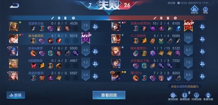 关羽百里点头像,最后四个投降。还打字骂人。虽然是匹配,输了也不掉星,举报又不成功,你玩什么?说实话很爱骂菜的队友。那至少还想赢这种专门搞你心态的队友,比菜更可怕。 游戏确实快乐,但是我不快乐,算了,估计是现实受到排挤了,不然也不会半夜奋战峡谷。估计刚下班吧。😇😇😇