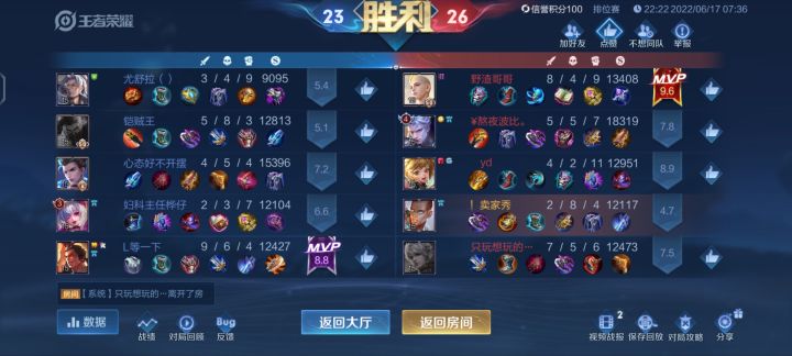 狗屁游戏,我玩这么长时间游戏,每天都要到強制下线护眼,赢一把输两把,差3把上王者,来个11连跪?一颗星卡两天,上去了又连跪,又卡同一颗星,把把智障,还禁言个狗屁,每把都绿标觉得自己天选之人,赛后0一8,举报还无用,摆烂哥一堆,打三天一天全输光,还重复两次,谁心态不炸?就放5天假,全花你游戏上了,sm东西