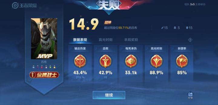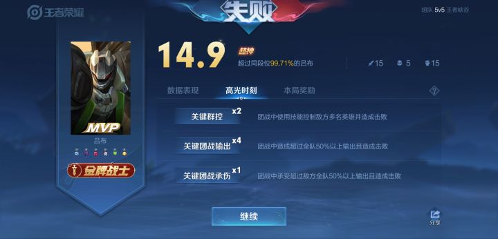 elo机制真的牛逼,今天打六把三把mvp,还是全输。甚至我的吕布都打成这样了还是输,两个关键群控,四个团战输出,一个团战承伤,一个嗜血闪现。