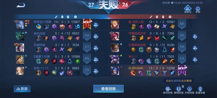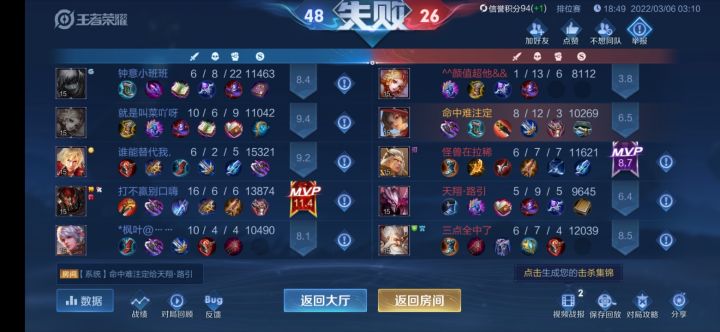 玩的很好,机制也很好,这样子居然都举报失败,来呗,大家一起破坏游戏平衡,反向上分,打个野第一件出大蓝刀,然后鞋子就不详,三百出头的物攻和一百六的法强,得亏对面没有瑶,要是有瑶估计都追着娜可露露打,还敢当着对面的脸上开龙,搞笑,一套下去掉一两格血,打什么?这还举报失败是我不能理解的,对局居然也不说恶意出装,我玩无限乱斗瑶出ad到处乱杀,就给警告恶意出装扣分,他这个就正常出装了呗?