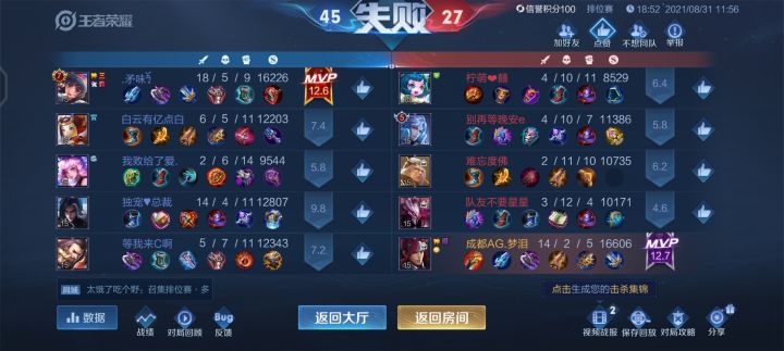 ID习惯喝粥,多次不作为,到最后,兵线都懒得清,你扣一两分意思意思也可以,英雄是他们选的,打的又垃圾,真的无语了,猥琐发育又不会,兵线重要也不知道,就要打人,真的无语了,这什么队友,打个克隆也就这了,王者也就这了。