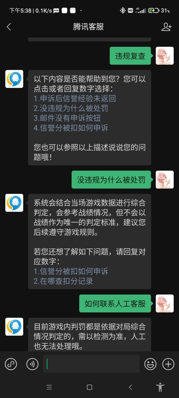 尽力,惨遭对面韩信借号炸鱼,排位练英雄的射手说我不会玩还抢打野,她说她说了五楼打野,但是我反正没有看到她说过,小喇叭也开着,我严重怀疑他是不是在小队组队语音说的。我明明补位还帮别人抢了对抗路。射手出装自己品,打人机都能连跪的。复查也不成功,我百思不得其解自己尽力了前期被对抗路卖,推塔,扛伤,守家守野做错了什么,被举报不说什么理由,想问问人工客服是因为什么理由被举报的,也找不到真人客服。不坑从不挂机,倒不在乎这三分信誉分,但是谁想被冤枉。