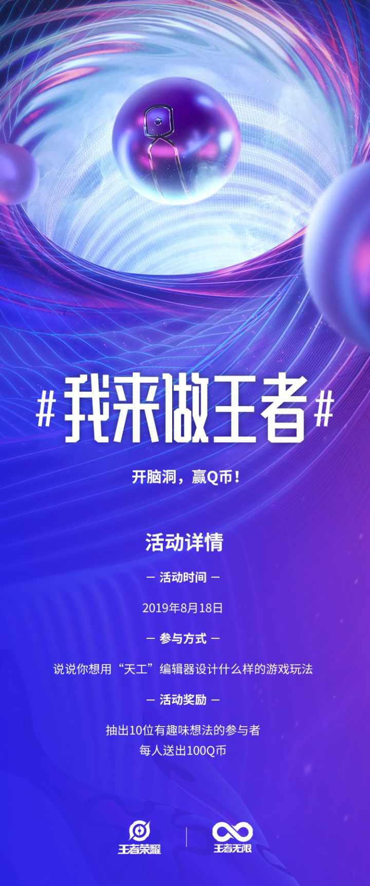 王者荣耀地图编辑器【天工】即将上线!召唤师们可以自定义对战地图啦~英雄设计场景搭建剧情编写关卡创造统统不在话下!妲己宝宝已经在考虑怎么用它给自己建一个大大的草丛了。召唤师大大们还有什么有趣的玩法不妨在下方留言吧~妲己宝宝将从符合题意的回复中随机抽取10位平分1000QB活动时间: 2019年8月18日 23:59:59截止召唤师大大快邀请好友一起来开脑洞叭~附: