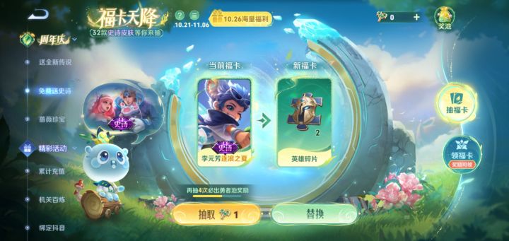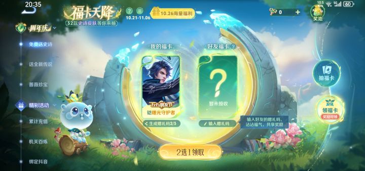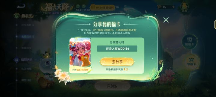 看日期活动快结束了,没领取的快领啦,分享得还有三次有需要的可以领取噢#王者荣耀福卡
