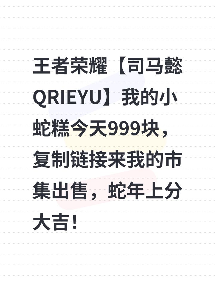 王者荣耀【司马懿QRIEYU】我的小蛇糕今天999块,复制链接来我的市集出售,蛇年上分大吉!