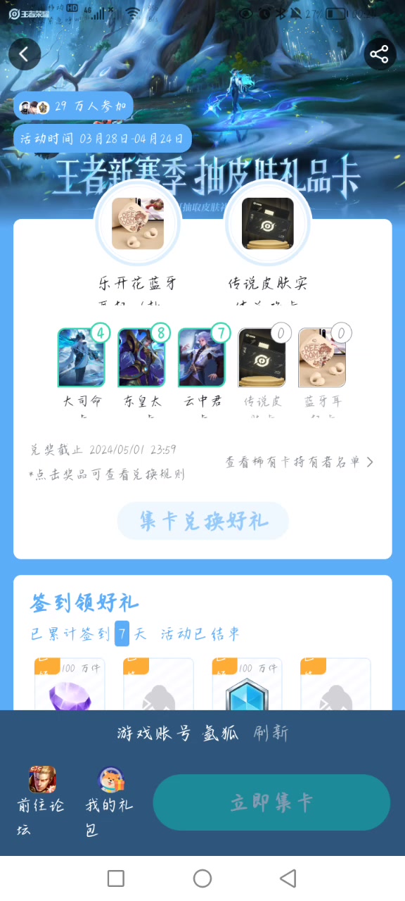 兄弟们,你们集卡活动有抽到传说皮肤的吗?为啥我去年是288皮肤,今年还是288皮肤呀?