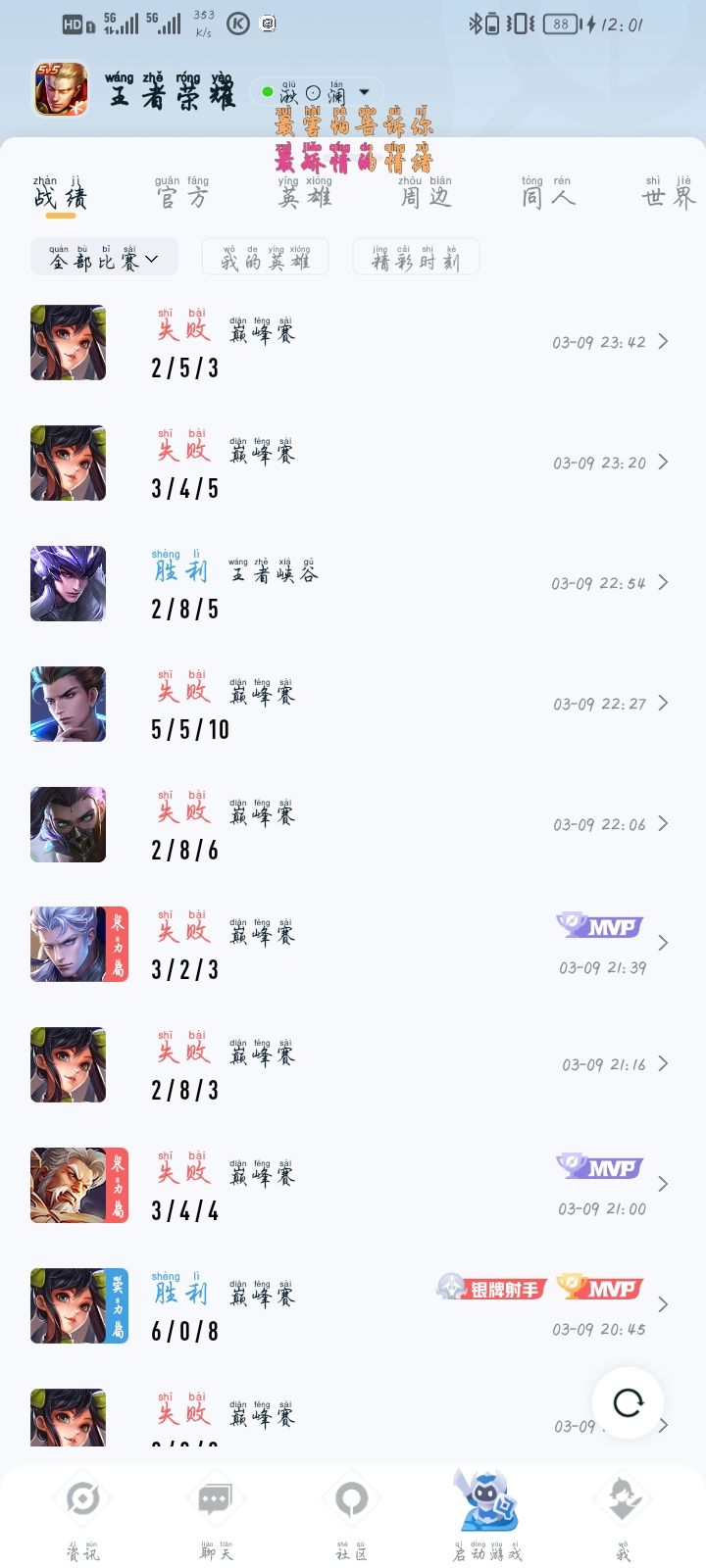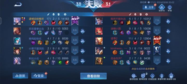 当然了,这把我还是有问题的,之所以打团打不过就是因为团战我几乎切不到c(老是空技能,当然我们家是暗信,打团本来也不好打),我八杠六,六个人头都是蹲的。总的来说就是,我意识过得去(小白局蹲人没问题,基本能蹲到,但是经常因为操作拉胯没打过或者没杀死,而且基本不会被对面蹲到,死六次不是蹲到被反杀就是打团技能全空被杀),操作可能只有星耀四的水准(有设备因素,三十帧的痛,打团骤降到20帧甚至15帧)