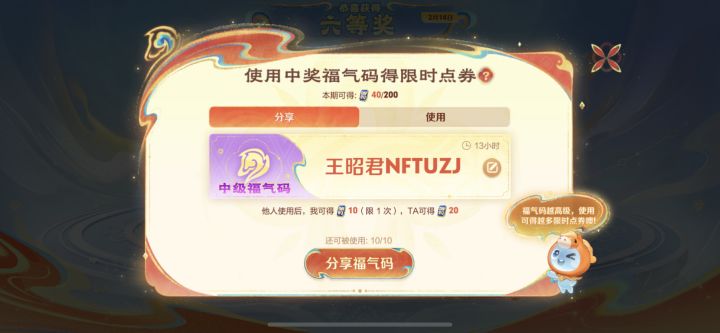 王者荣耀送限时点券【中级福气码王昭君NFTUZJ】中级福气码,使用可得20限时点券,复制口令传递心愿吧!