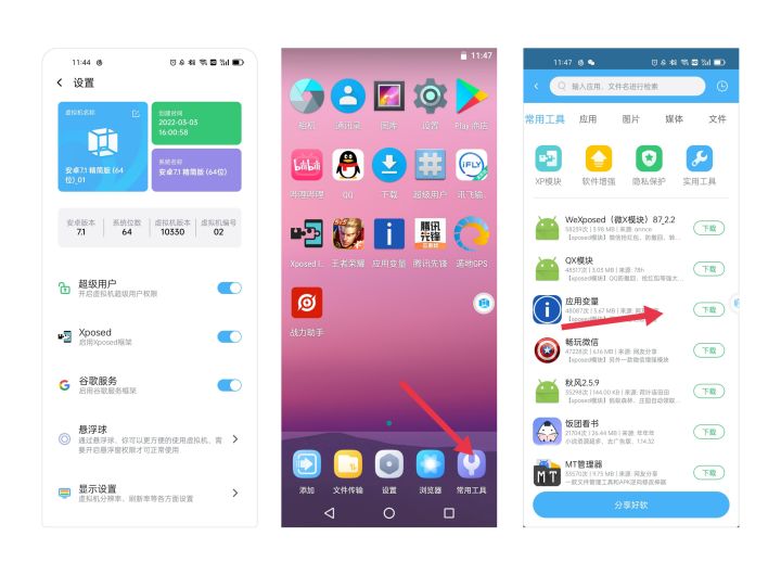 想要使用应用变量伪装手机型号,首先必须下载安装xposed框架,手机也需要root过才行。这里分享一个小技巧,不需要root真机,直接在手机虚拟机(模拟真机安卓系统自带root,预装了XP框架)中,运行应用变量和王者即可。具体教程如下:第一步,这里以自用版的手机虚拟机(VMOS Pro)为例,下载安装好后进入设置中,打开“超级用户”和“Xposed”。进入“常用工具”-下载“应用变量”。第