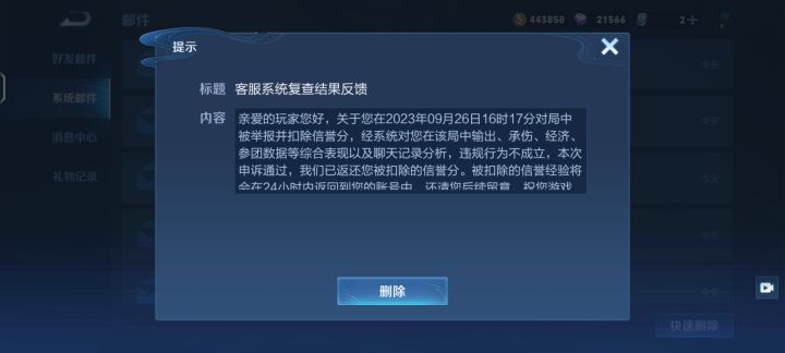 事情是这样的,今天有一把排位芈月打对面夏洛特,我战绩0-8-4,被举报扣3分,然后我申诉了。成功了首先是我全场输出23,承伤32,两队人头比9:19。其次我没有故意送,也没有喷队友啥的,然后我申诉之前去点了个bug反馈,说它系统调伤害调数据,我带的32攻速,没吃到夏洛特被动的情况下都普攻很慢,然后对面打人的伤害也不科学,承伤跟死亡数据根本对不上,所以我反馈了。我也没想着他能返还信誉分啥的,毕