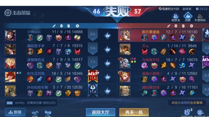 这巅峰赛的队友真让人无语,我一楼先选的,然后二楼射手挂机,四楼跟五楼秒选,对面全是永夜加魔女,打野不会开龙,这巅峰赛是我先颠疯吧