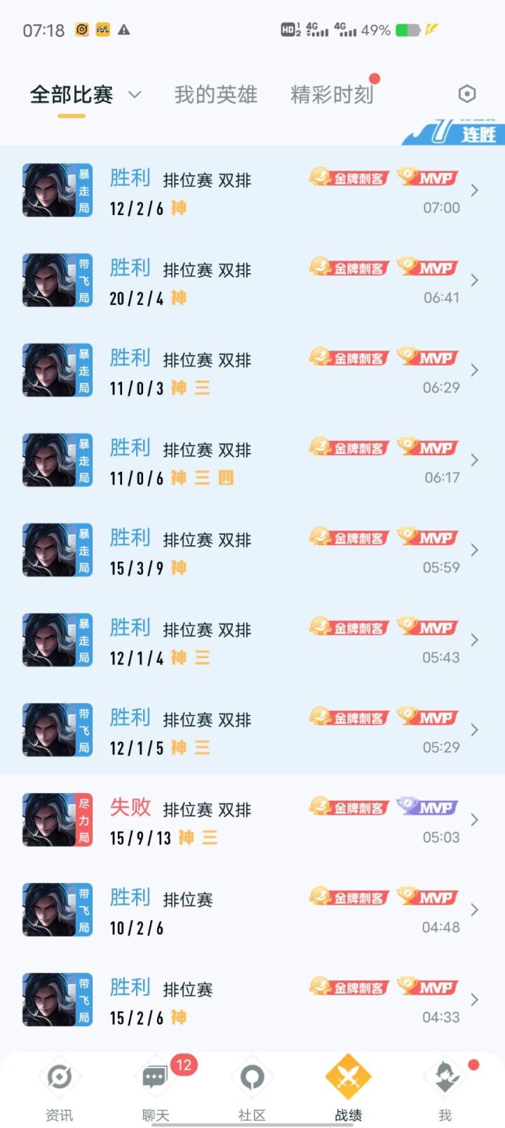 我真的是贱啊三四个月没玩,新赛季了,来了兴趣就玩了一天多,主玩吕布,打的钻石局,因为这个段位没有怎么会玩的,连胜了十局然后噩梦开始了不管我玩什么都输,十二把里边前六把是把排位保护卡和勇者积分打没了,系统故意针对我,就是想让我掉星,输掉了所有的保护卡,第七八把掉了两颗星才停下来,然后就都是赢两把输两把,我很负责任的说都是很菜的队友,赢得也是我拿吕布乱杀,输的也是我MVP抗伤输出不是第一就是第二