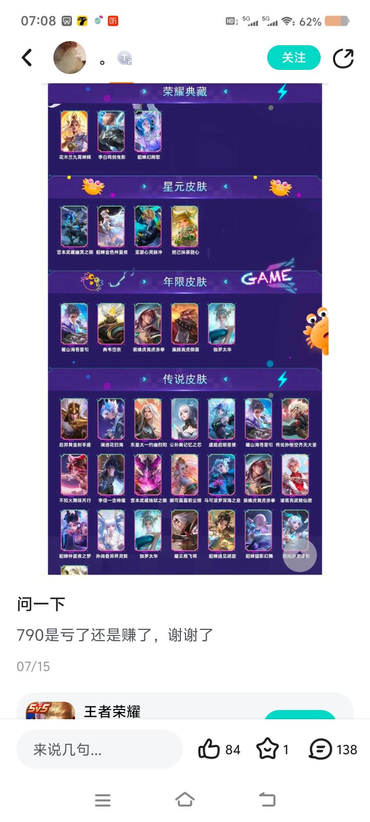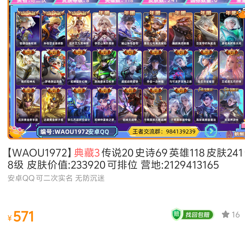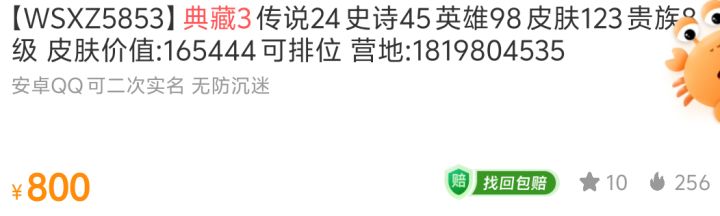 我就在评论区说了一句不值,在那疯狂咬我,既然自己都觉得值了,那你问什么呢?找存在感吗?现在典藏三个传说20普遍,价格就在800到700之间,790买这么一个号本来就不太值,接近在这个号正常价格的顶级了,非要跟你说一句值才开心吗?