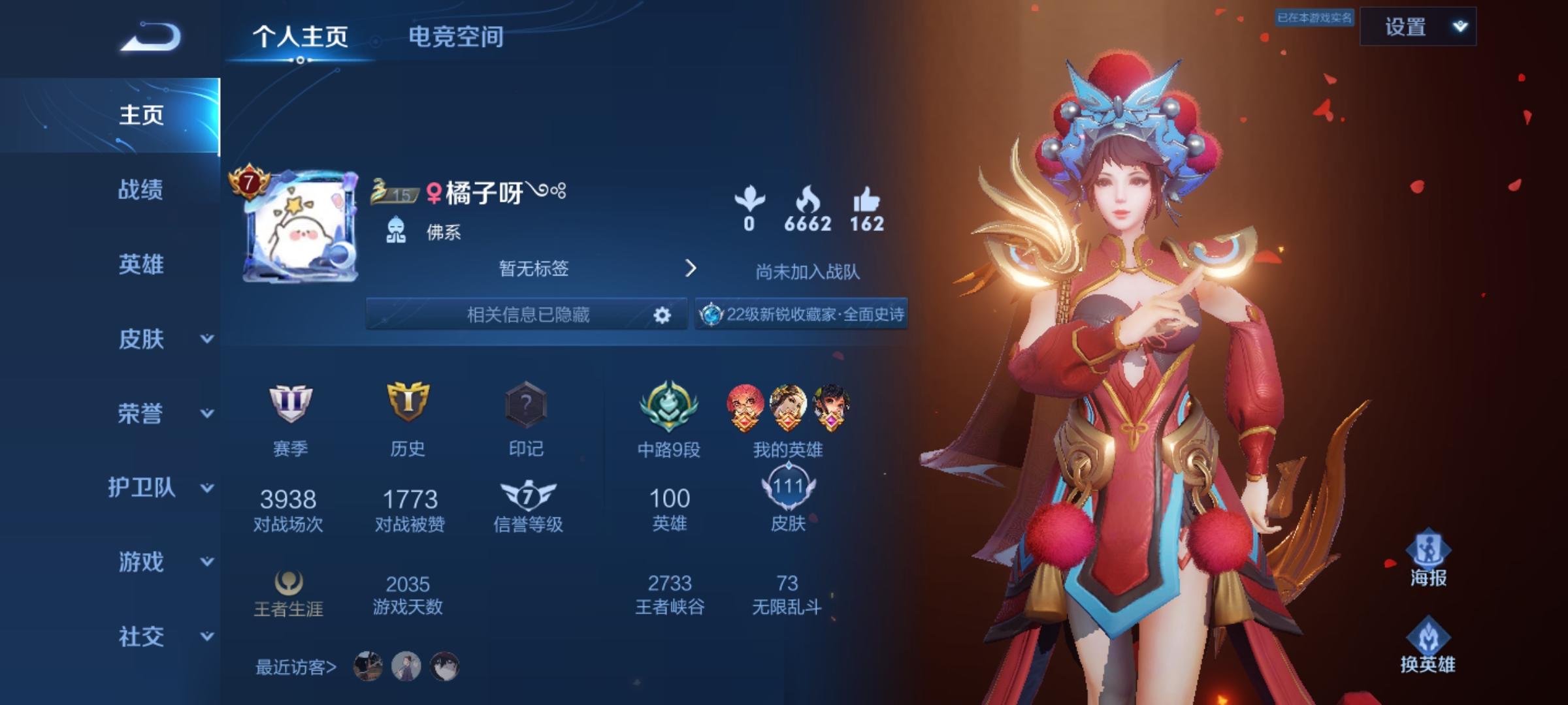 v区王者dd,主玩打野射手,也可以补其他位置,来个唠嗑的,目前王者低星,有意滴滴,不喜欢动不动就骂人的,坑点无所谓,不在乎星星,开心就好