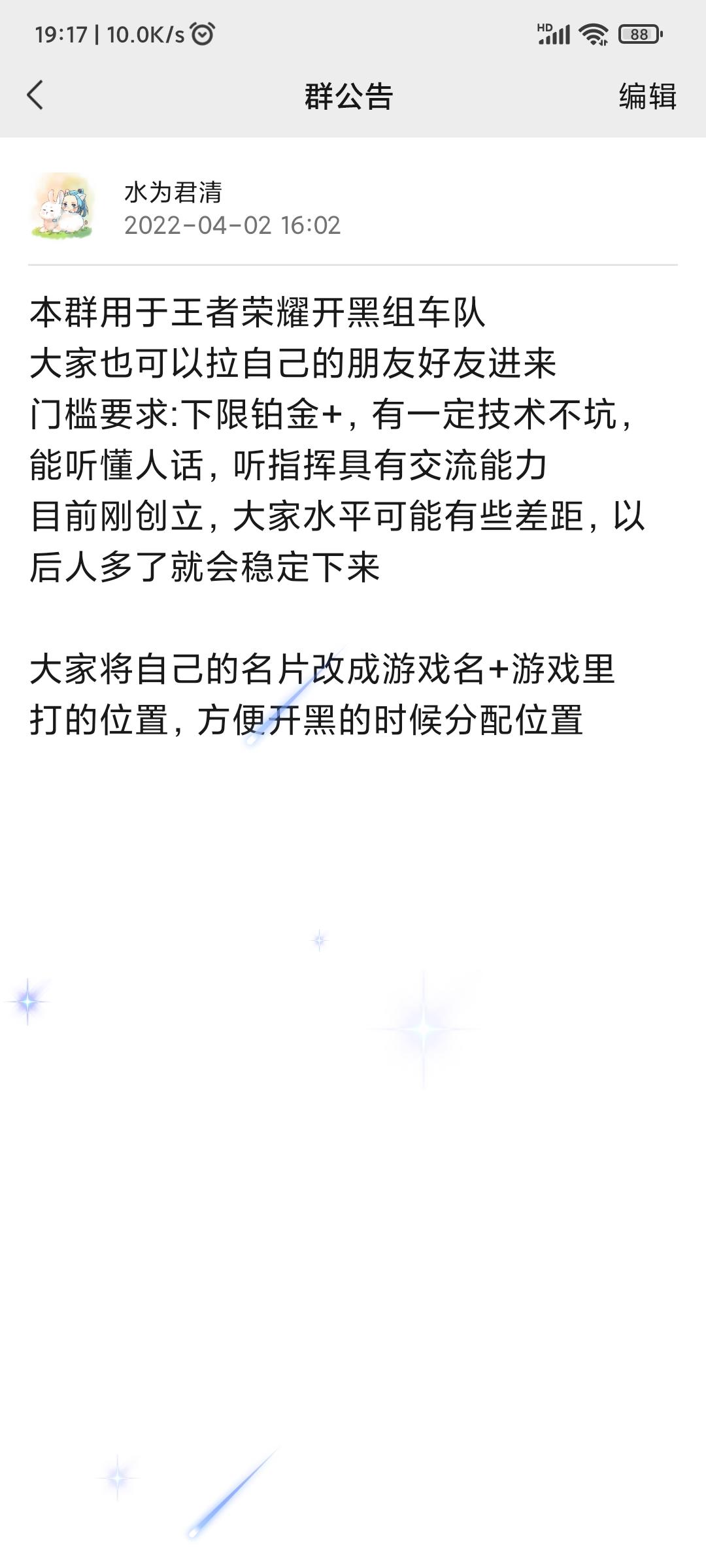安卓-微信开黑群招人S27赛季冲分,有大佬一天开18小时车要求:S27继承段位最低铂金起,有一定技术不坑,游戏外能交流讨论,游戏内能打字/语音,心态好即可里面气氛良好,经常有大神交流讨论