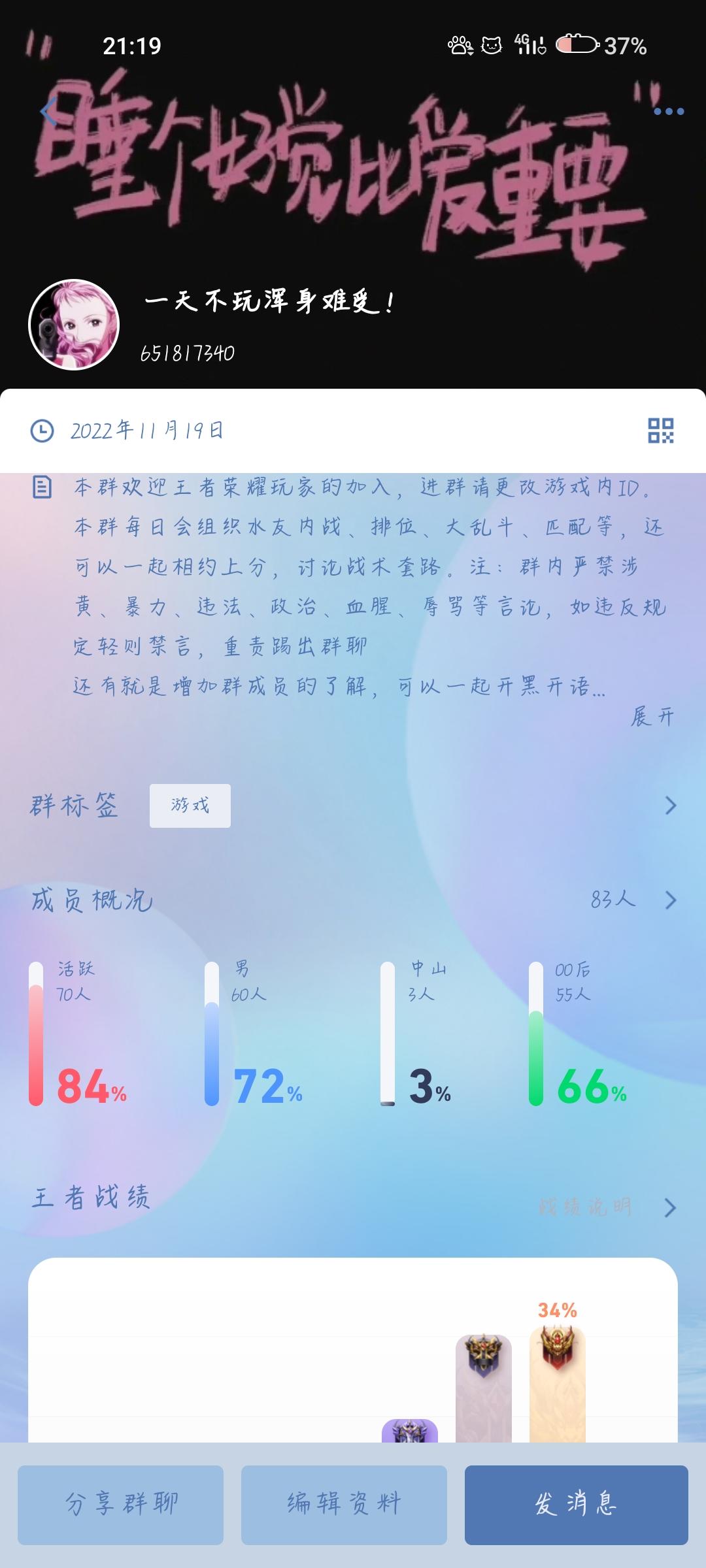 希望各位到来,加入我们这个小群体,不限制段位,不限制性别,不限制大区,聊天开黑交友都可以,希望这个小圈子越来越大