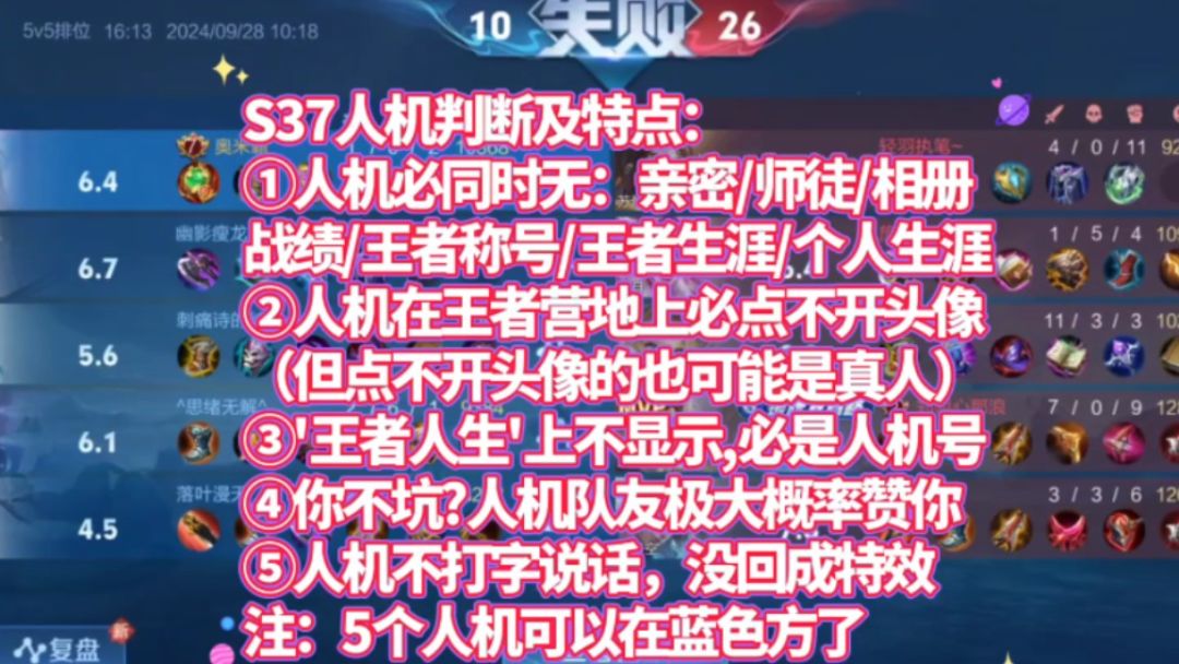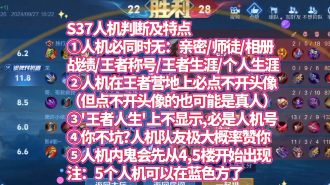 新赛季。。不过一切又从头开始 S36的最后一场绝唱: 【S36巅峰惜命雅典娜:磊哥对的!推塔越多?扣分越多【究极举报】-哔哩哔哩】 https://b23.tv/sYicOE2 S37的第1场排位: 【S37·王者荣耀:第1局第10评分在红色方碰到5个人机敌人【真相】-哔哩哔哩】 https://b23.tv/84ZSEAW S37的第2场排位&展示所有奇怪对局在评论区: 【S37·王者荣耀:上局