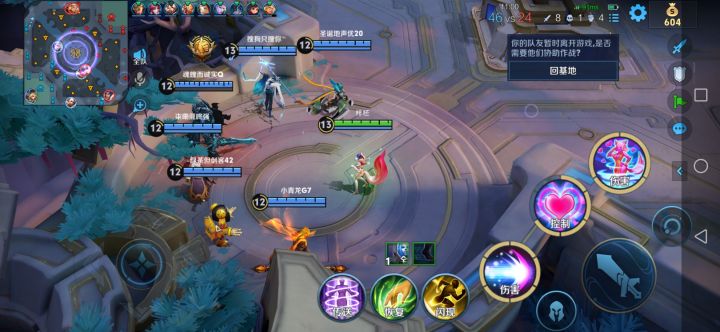 看图,10V10里面会安排6个人机,当连胜过多,就会遇到上图所示,六个人机全挂机且不动,再看右上角,只有“回基地”一个选项。