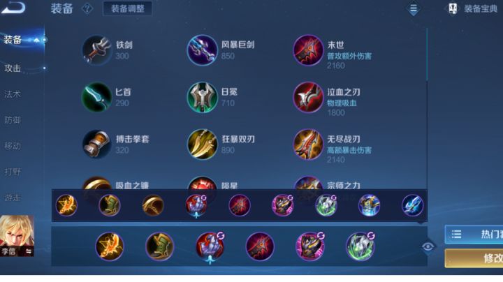 修改于24-11-9,李信增强后暗信出装总体思路T0装备(必出):布甲鞋、电刀、T1装备(强势):末世(几乎必出)、血魔(几乎必出)、爆裂甲/不详(对面有两个需要攻速的就不详)魔女/永夜(对面爆发高或有梦魇制裁,永夜的回血聊胜于无,对面伤害低,回血就可能有救命的作用)T2装备(普通):苍穹,现在只有碰到马克吕布才出苍穹,被控不能点鸡爪,偷塔专用,作用单一血刀,作用单一,就续