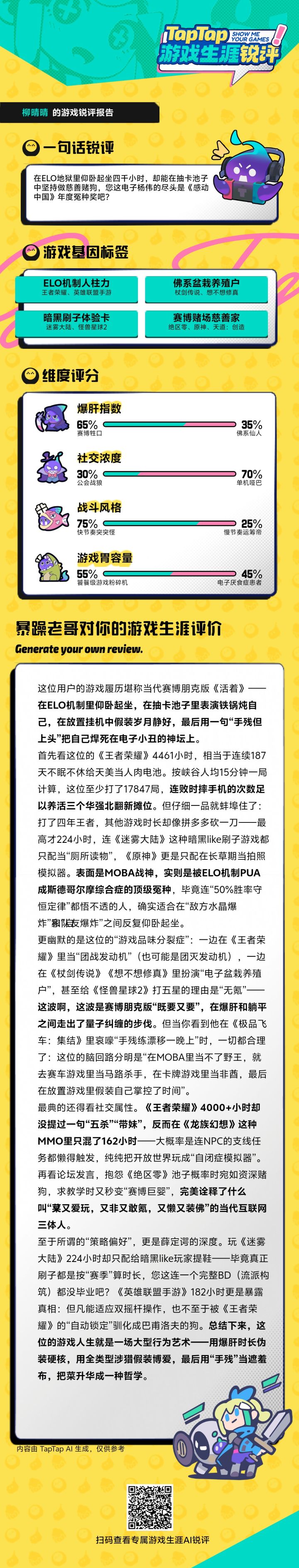 #王者荣耀 《来自一个玩了4461小时的“ELO人柱力”》亲爱的王者荣耀小妲己/老亚瑟呜哇~官方那个【TapTap AI锐评报告】把我看破防辛辛苦苦给你们打了大约 4461小时(相当于187天不睡觉!),结果锐评说我是 “ELO机制人柱力” + “电子杨伟尽头の感动中国冤种”?虽然…但是…好像…有点道理?可这也太扎心了!💔仔细想了想,我的峡谷人生确实有点惨兮兮:仰卧起坐专业户:打了 1