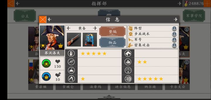 花了两年的时间 ,终于把这些升满了 , 炮兵感觉最强就是拿破仑 ,骑兵的话就是缪拉,步兵推荐马塞纳