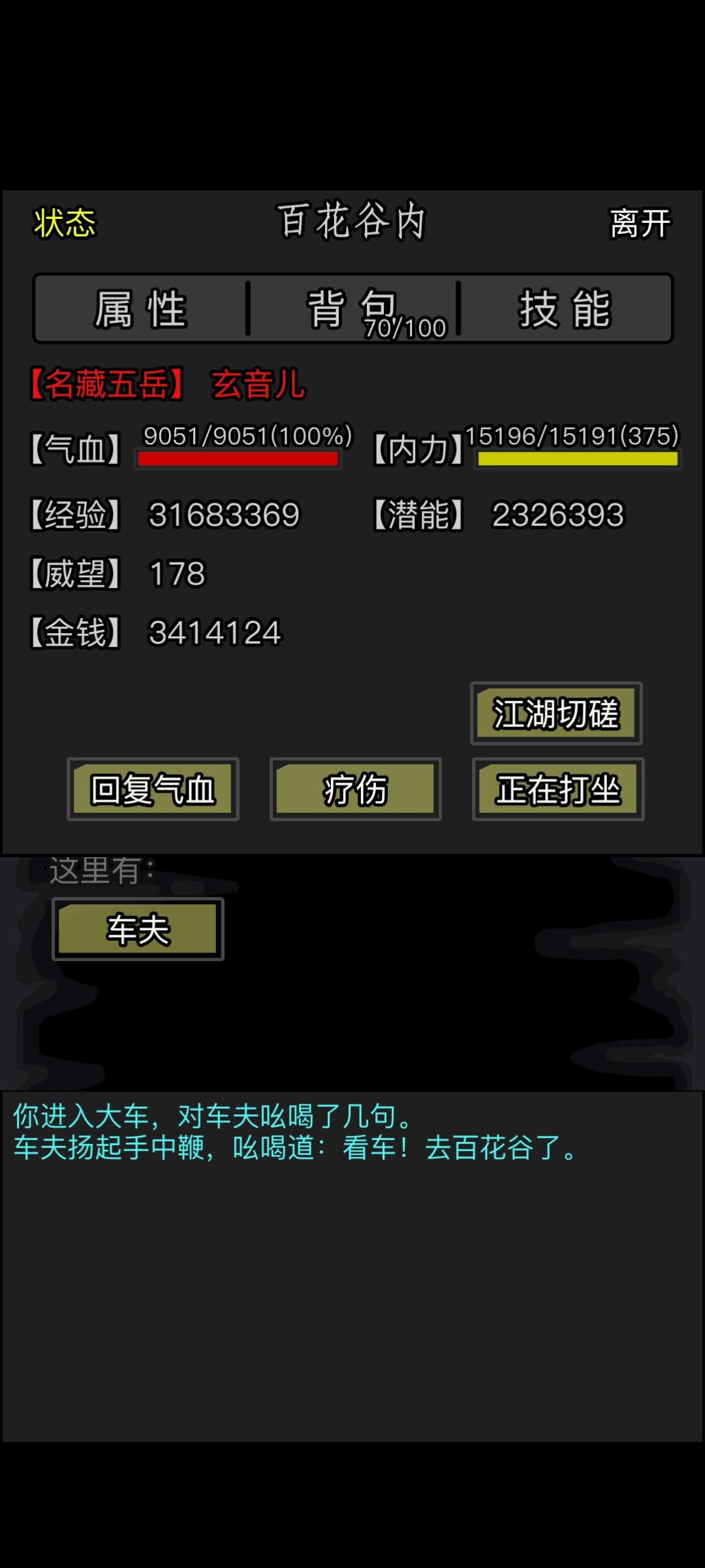 BUG:内力无法恢复最近事件:在家园门口发现逍遥林纪什么来着求救,选择帮助后,直接进入第六章节,寻找止血草并赠送后完成任务,后通过车夫直接返回家园,与第三个怪客切磋失败后发现失败原因是内力不满,尝试恢复内力失败,打坐亦无法恢复。复现率:未知现阶段解决方案:重启游戏