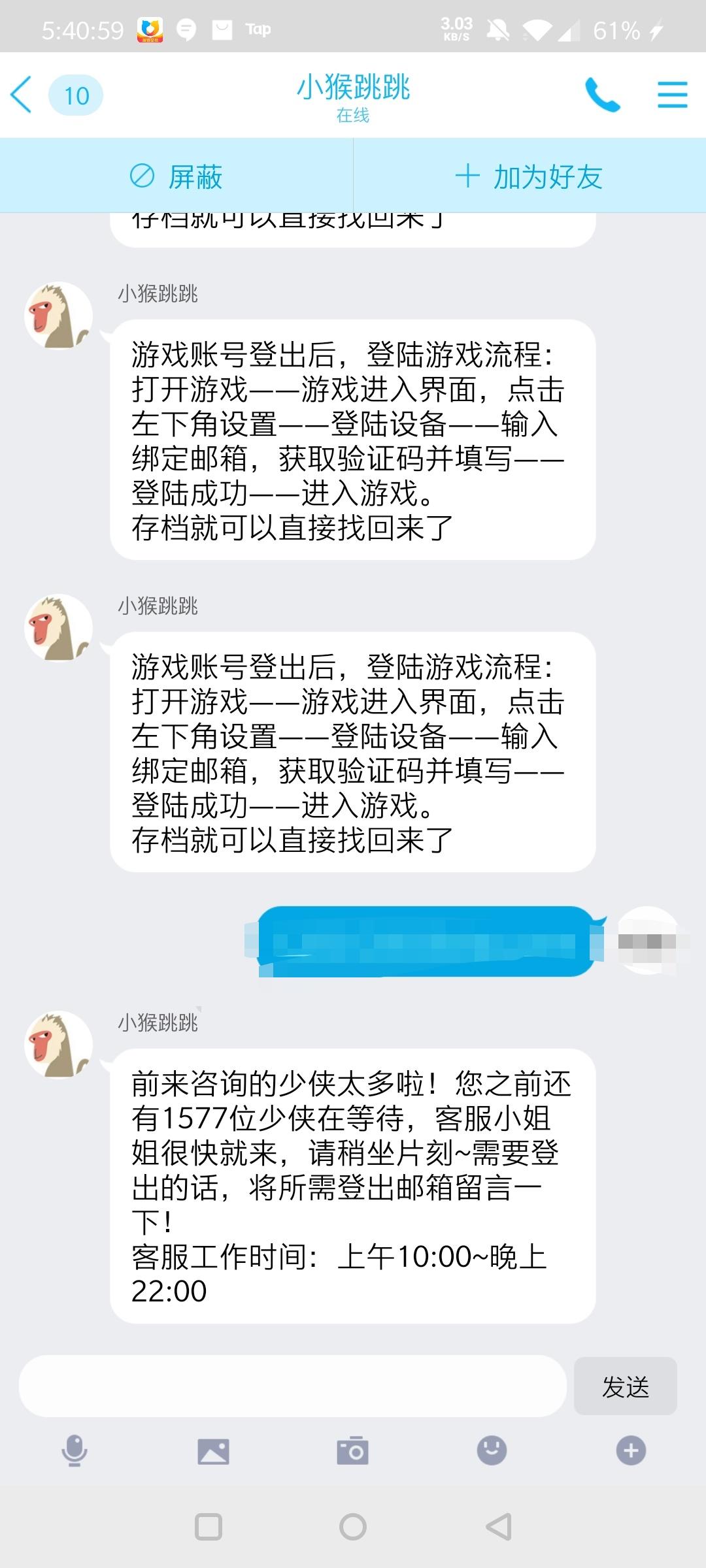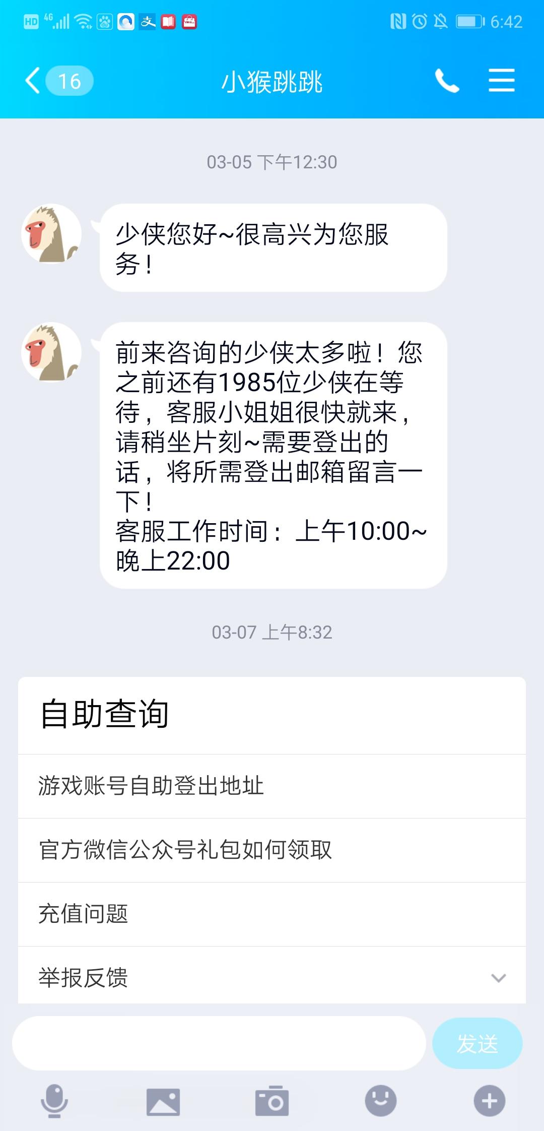 好不容易排过了2000人,终于有客服接待了,可是不巧正好老板找我,等我回来的时候,又从1700+开始重排🙃🙃🙃我又不是没有留言邮箱和角色名??不愿意帮我登出就给我留个ID我自己来呗??重排几个意思?工作日我还得12小时等客服吗??我简直惊呆了这个游戏入坑三个月,花了一百多,还剩几千元宝和40多天江湖名士,排队两次这么长时间,足够我入坑别的放置游戏了,你也不是不可替代🙃