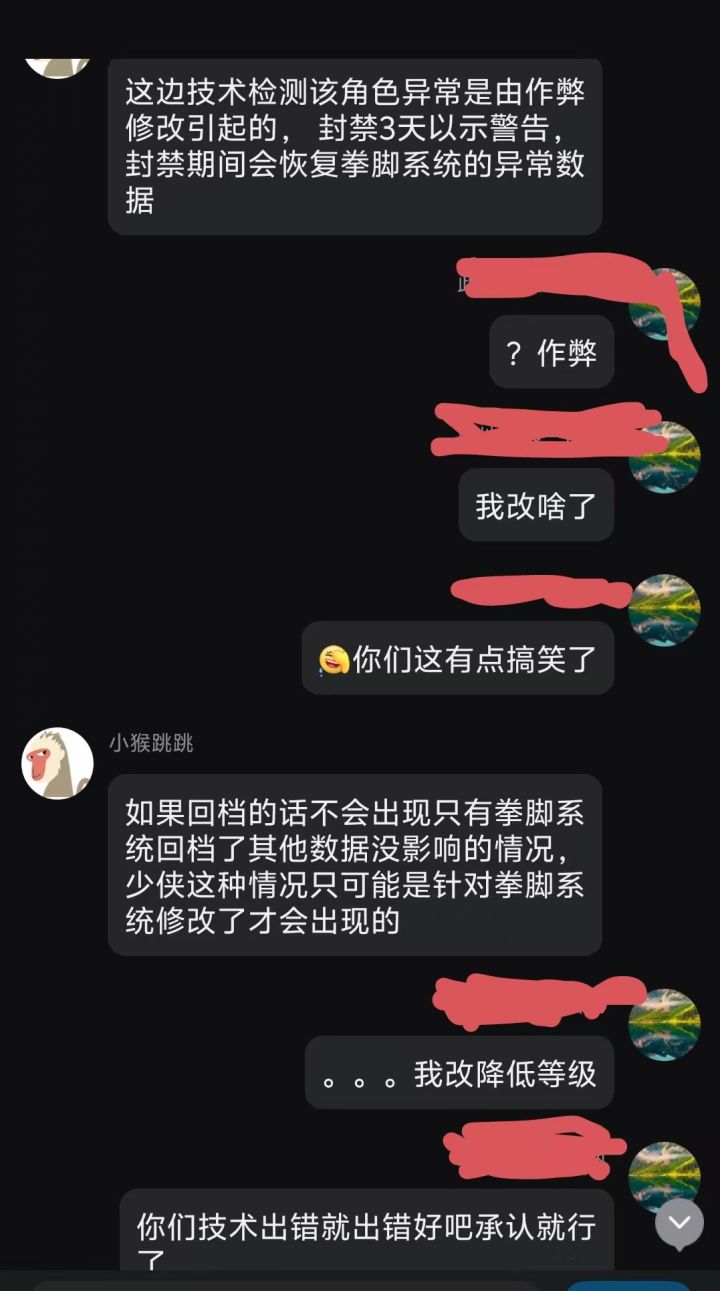 我老号玩了快大半年,你系统因为卡个bug进不去,我这边拳脚给退到290,给你反馈你给劳资封三天,说劳资给你修改了,说到时候拳脚等级就恢复正常我也没说什么,今天一看还是290(号我天天点个八小时增加阅历)我新号都300了,老号还是290你给我恢复了吗?我没改了你给我封了我也不计较,但你这数据没给我恢复还给我封了,司马技术部