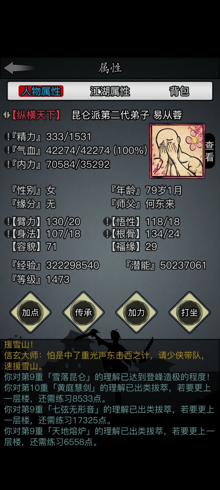 255臂力 不加力箕风客:纯挂机,打了15分钟;三 更:点“恢复”,打了13分钟;陆知白:逃跑一次,打了6分钟。