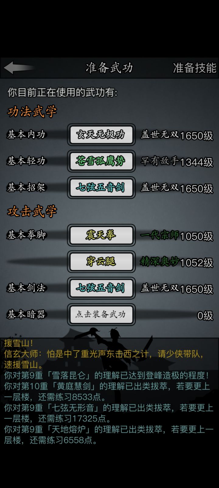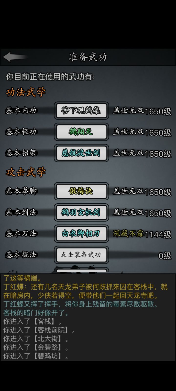 天狼门派套,外加龙腿主手,磨内后与三英刮痧硬抗,有来有回的打了半个时辰