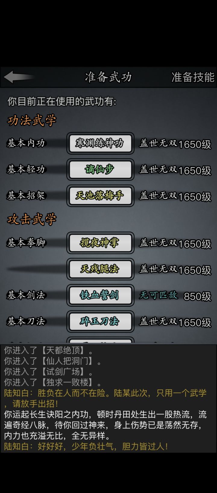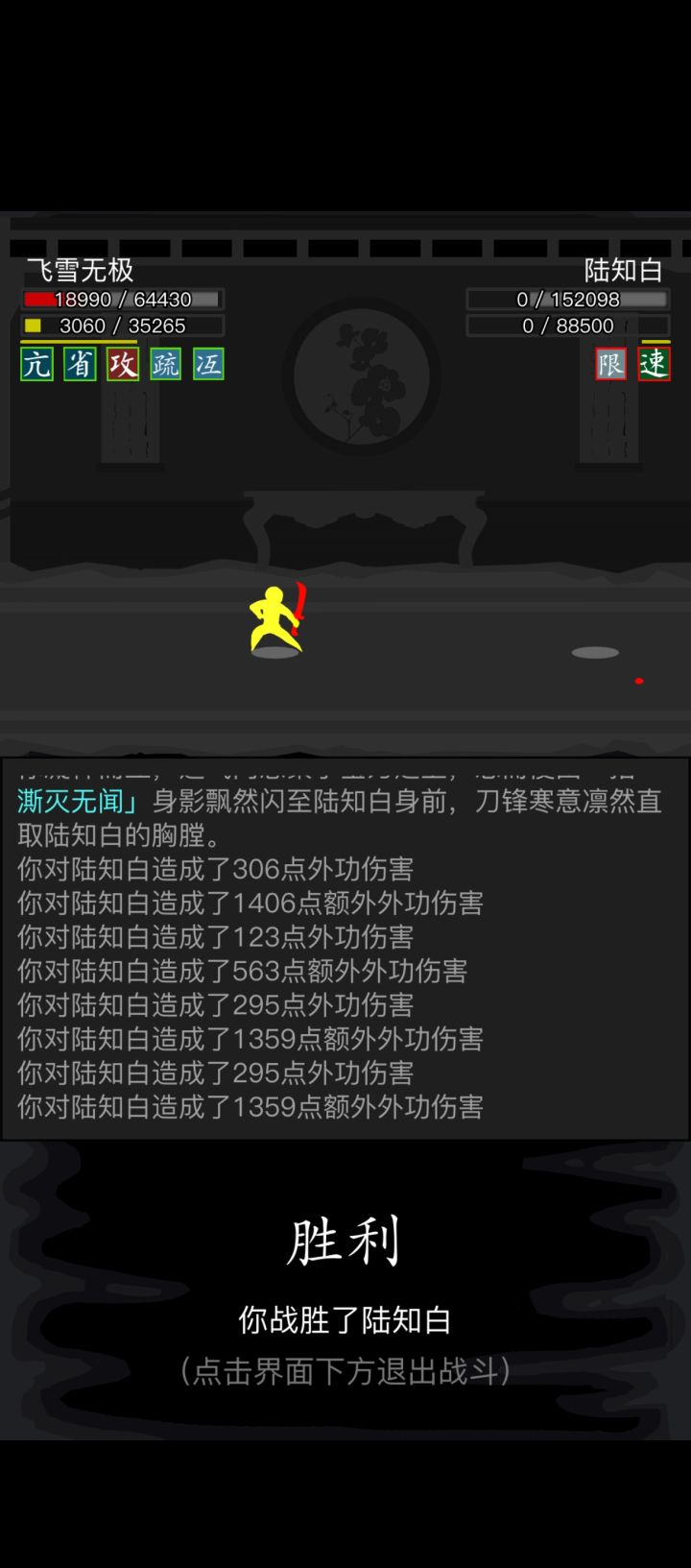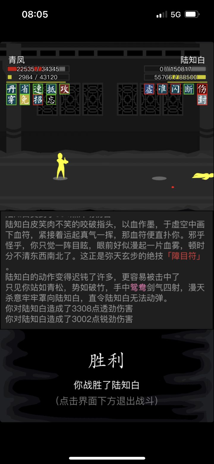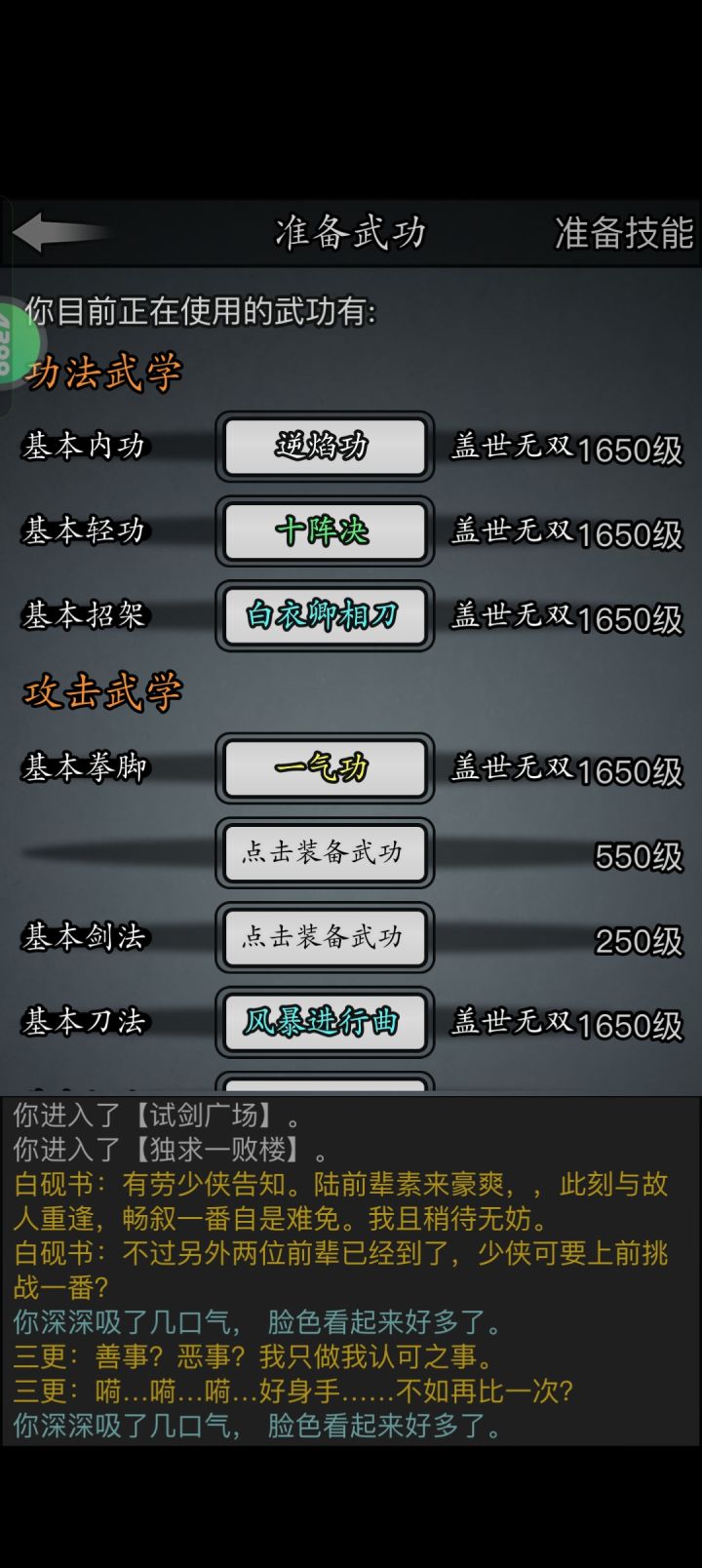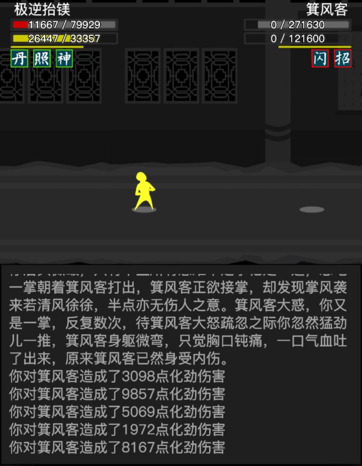 #放置江湖三英会武 因为这三个怪物可以磨血,所以可以先磨内力,打化劲伤害,因此离殇销魂掌那万年不用的惟别而已就派上了用场,开始先用惟别而已打化劲磨内力,磨完快速去找白老先生压低血线,这样惟别而已就能打出高额伤害,记得加力为0,不然没有神照经,长生诀很容易空内!