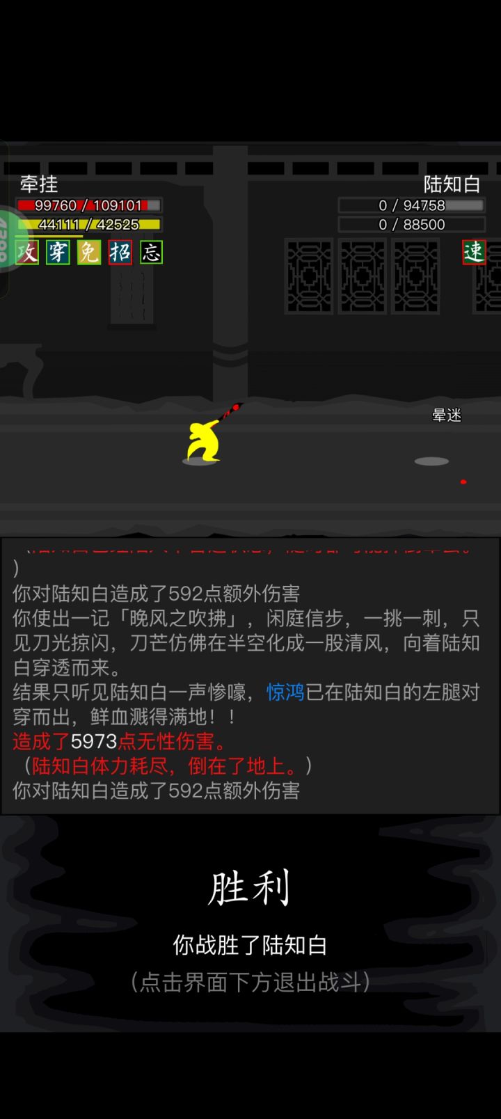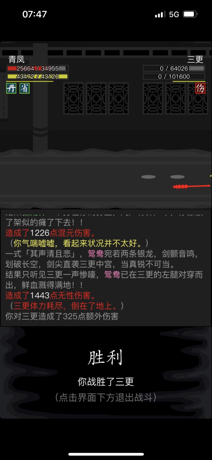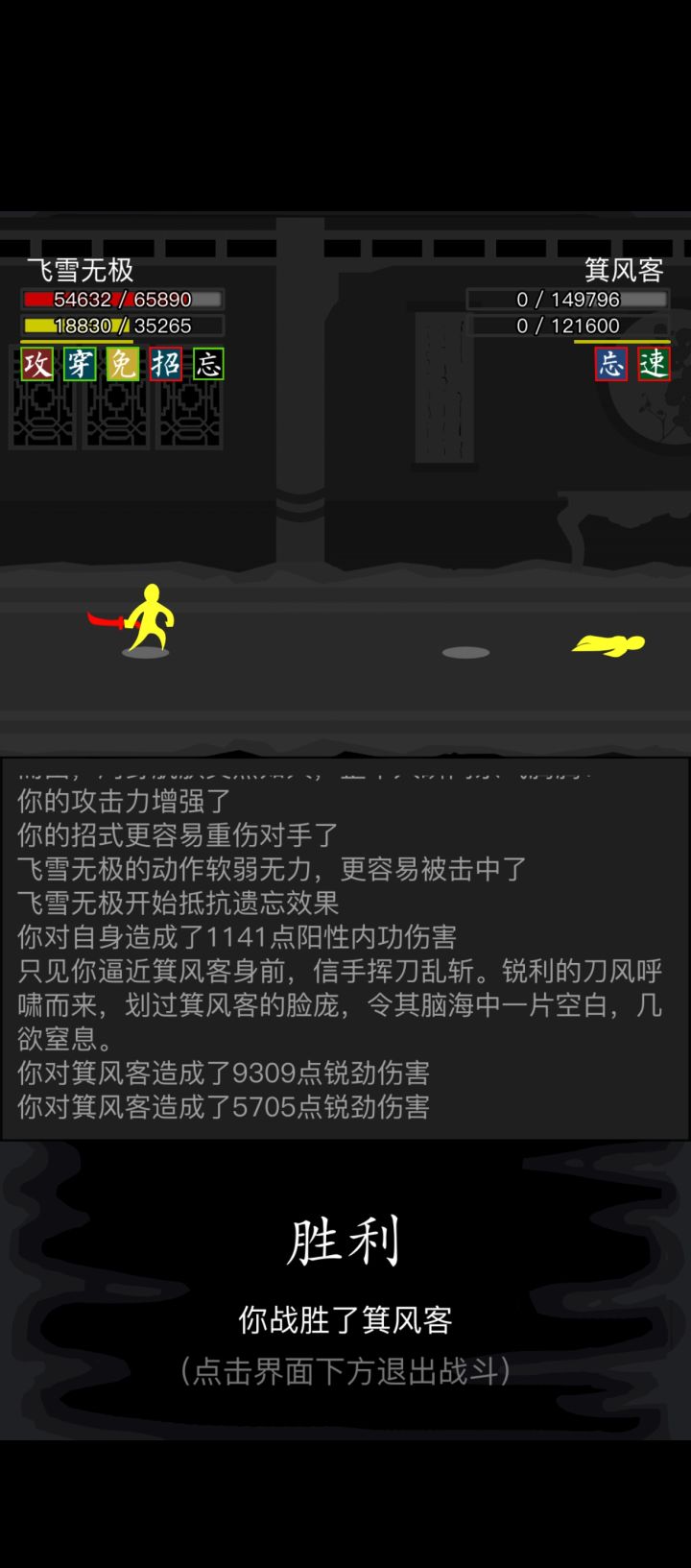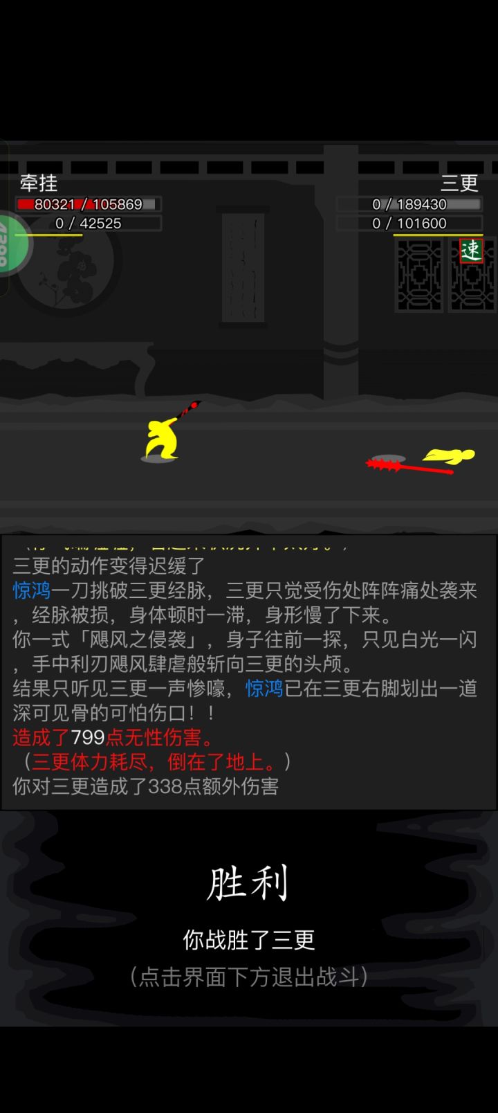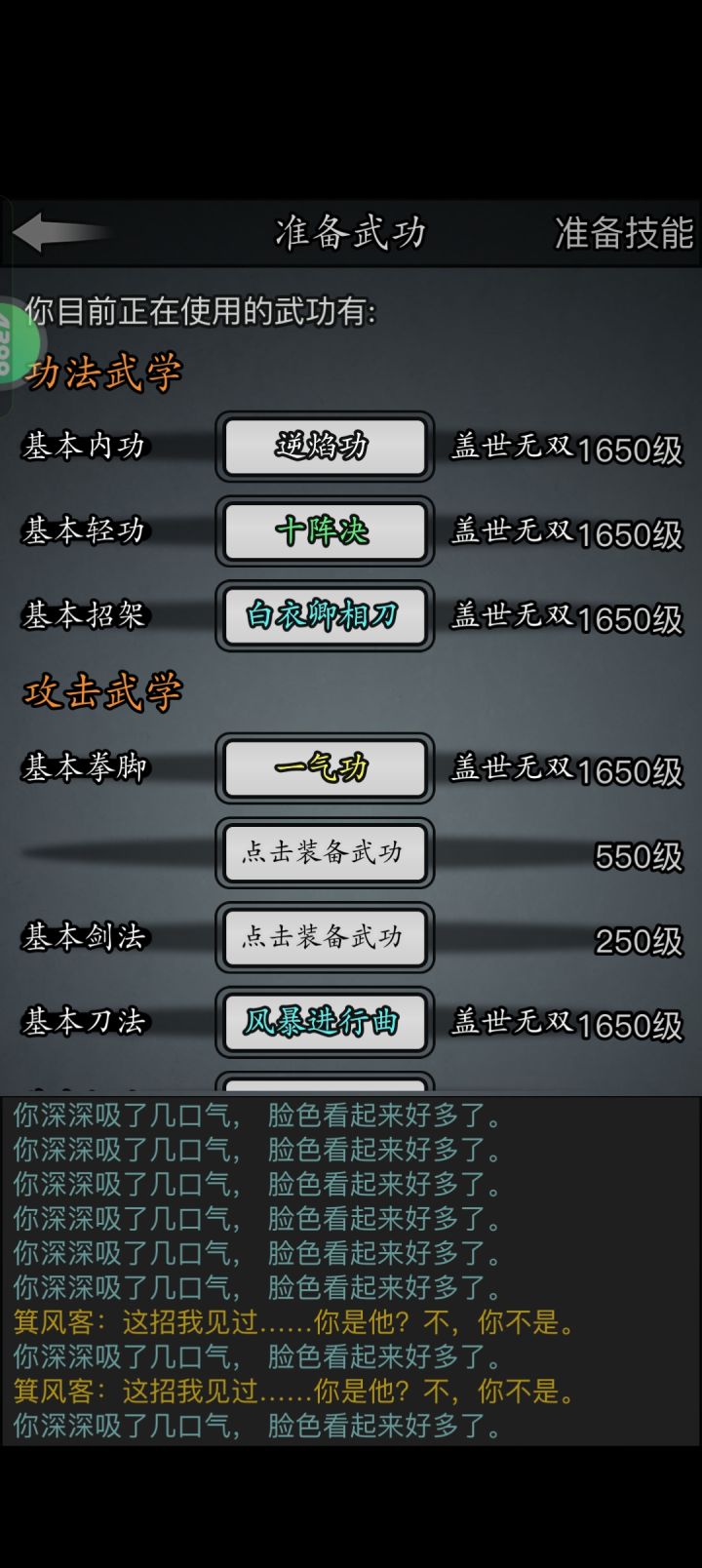 #放置江湖三英会武 因为这三个怪物可以磨血,所以可以先磨内力,打化劲伤害,因此离殇销魂掌那万年不用的惟别而已就派上了用场,开始先用惟别而已打化劲磨内力,磨完快速去找白老先生压低血线,这样惟别而已就能打出高额伤害,记得加力为0,不然没有神照经,长生诀很容易空内!