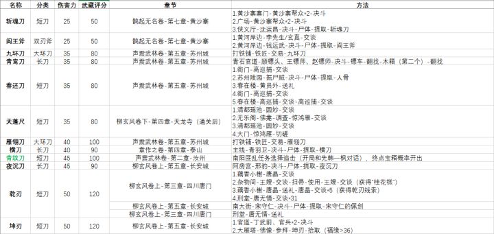 为了凑玄络对武藏评分的要求,我把前四十章的章节装备获取方式整合了一下,全收集完成的武藏评分能达到14695,评价武库充实。加上梦境任务、重光任务掉落和折掌镇海、藏锋破阵的装备,很容易就能达到紫电清霜。更新日志:4.29 - 把几个漏掉的装备补上了,折掌镇海和藏锋破阵也跟着攻略补上了,更新后武藏评分达到19981,重光和梦境任务等我二档走一遍记一下流程再更新5.14 - 更新了扬州城打铁铺出售