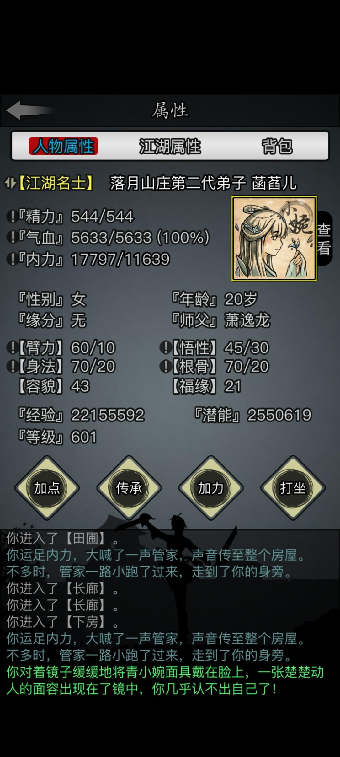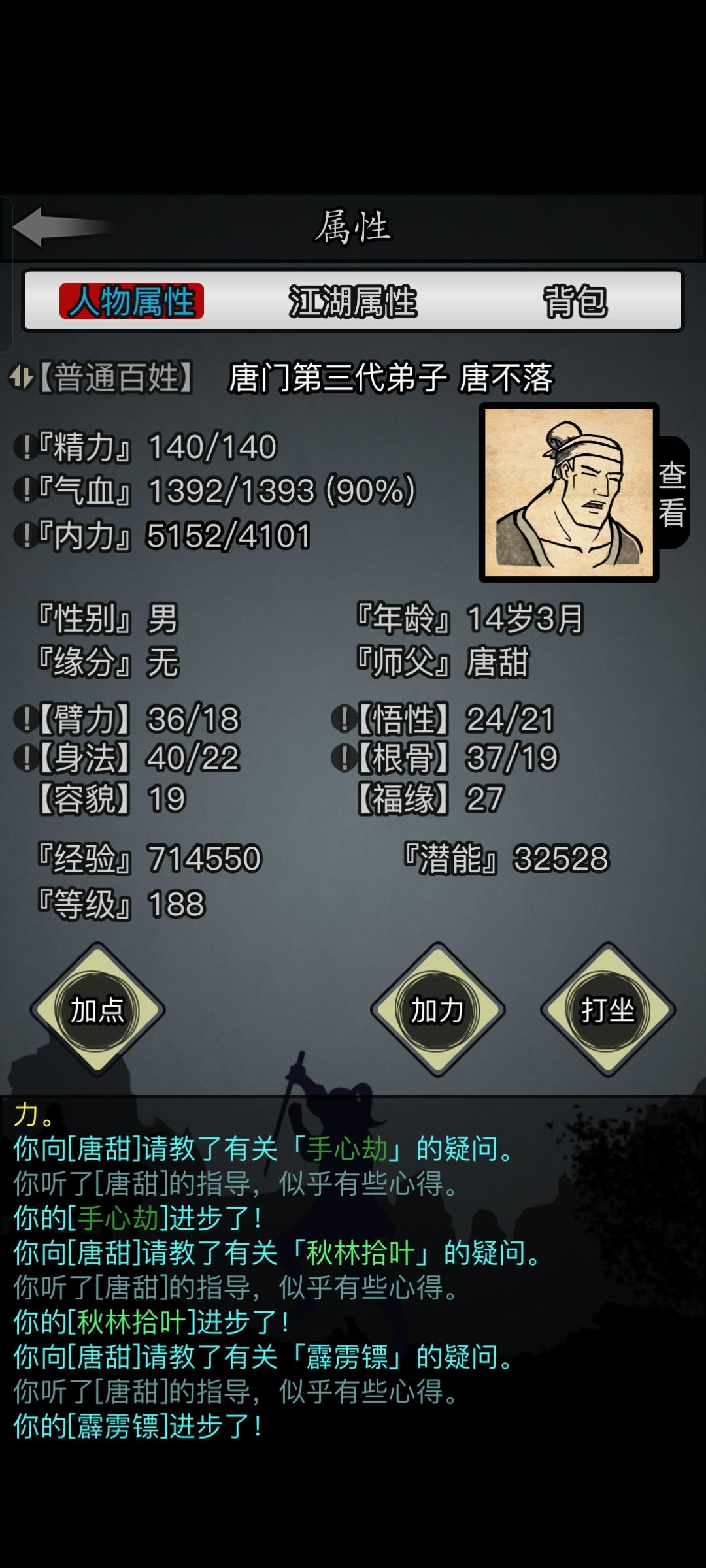 入坑一天了,感觉还不错不容易啊,155级了,太强了瞄了一眼攻略,27福源开局?切,我现在商人开局,1000碎银从天而降,谁与争锋?22福源吃了两个丹直升24了!24真好~真好~真好~真好~真好啊!先天19臂力,势不可挡,横扫千军!接下来就是门派啦,第一次踏入江湖,随手一选个顺眼的,华山山门大开,掌门亲迎,复兴有望。山门外赵玄机:“听说现今武林有一二三四五