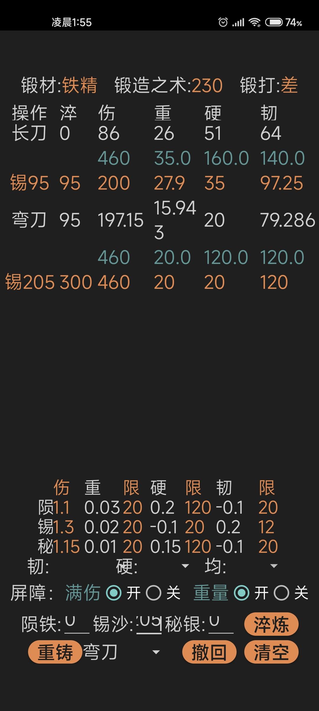 偶然在论坛里发现了大佬发布的,铁精长刀重铸短刀的满伤满重高韧方案。于是自己照葫芦画瓢,做了一个铁精长刀重铸弯刀,满伤满重高韧方案。萌新二转玩家,目前的铸造等级和读书等级,可以做铁精的神兵,于是乎打算直接追求铁精毕业的方案(不用寒铜做毕业的,就是因为不想刷铸造等级了)。求教,计划五转必去海鲸玩春刀了,(目前只考虑到五转后玩春刀门派套或者加一个江湖
