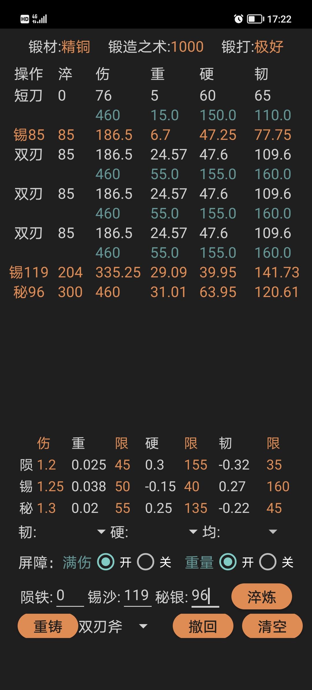 这寒铜金精常见不知道什么时候打的了,当时锻造400,打出了极好,没有重铸过。一直在淬,我也不记得什么时候开始淬玄铁(但是确确实实淬了很多次,因为我之前还有一把刺剑,所以想过全玄铁,可惜材料不够,阳口当时也没银票开)。但是现在玄铁淬得已经不加重了,而这个剑被我搞得是硬也不硬,韧也不韧,最重要的是重也不重,只有14.01(应该是这个数值)还是因为淬玄铁不加重我淬锐金加的0.01,伤害也不够高,按我