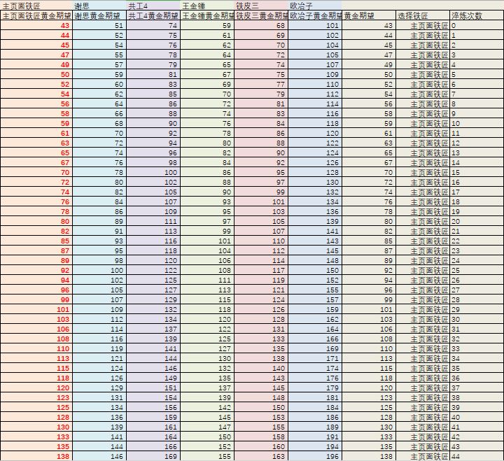 一、铁匠等级表从表中可以看出,共工1铁匠相当于淬炼价格略微高一点的霍铁(由上一篇贴子可知霍铁没什么用)而共工2铁匠等于铁皮三。所以只有共工3及以上的铁匠才有用。忠诚等级最高7级,所以满忠诚铁匠的铁匠等级是(7+2)*80=720。共工特性可以提高铁匠锻造等级,而且可以叠加。祸斗特性可以百分比降低神兵淬炼费用。二、说明铁匠等级越高,花费的黄金越多,而且成功概率有上限,成功概率达到上限之后