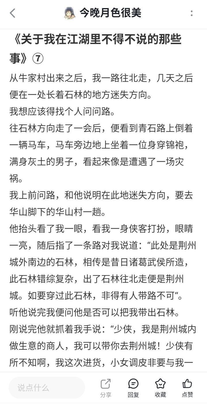 老叟笑了,说:“娃娃,有人就有恩怨,有恩怨就有江湖,人就是江湖,你怎样退出。我在这烟波江上,看武林起起伏伏。我曾见过九龙啸天的惊艳后辈,如流星一闪而逝。也崇敬过武林的前辈,一手七星踏月来去无踪。只是,后辈们未习得两全法,淡出江湖。前辈们隐群不出,忘记了初心。娃娃,这样的江湖你还喜欢么?”