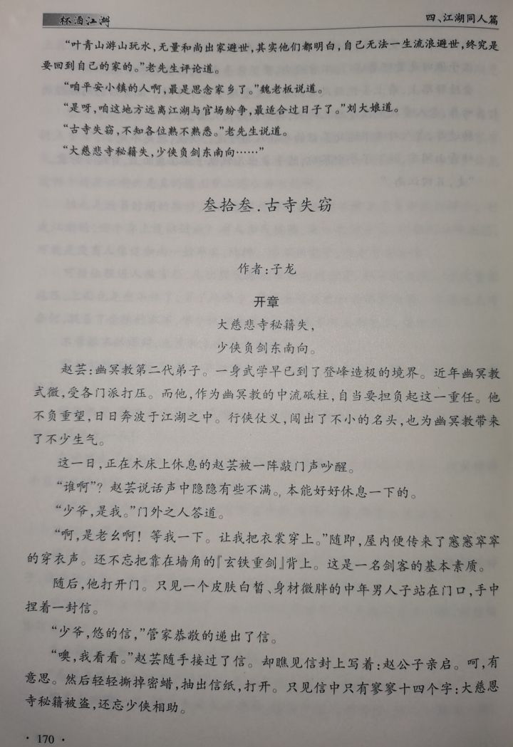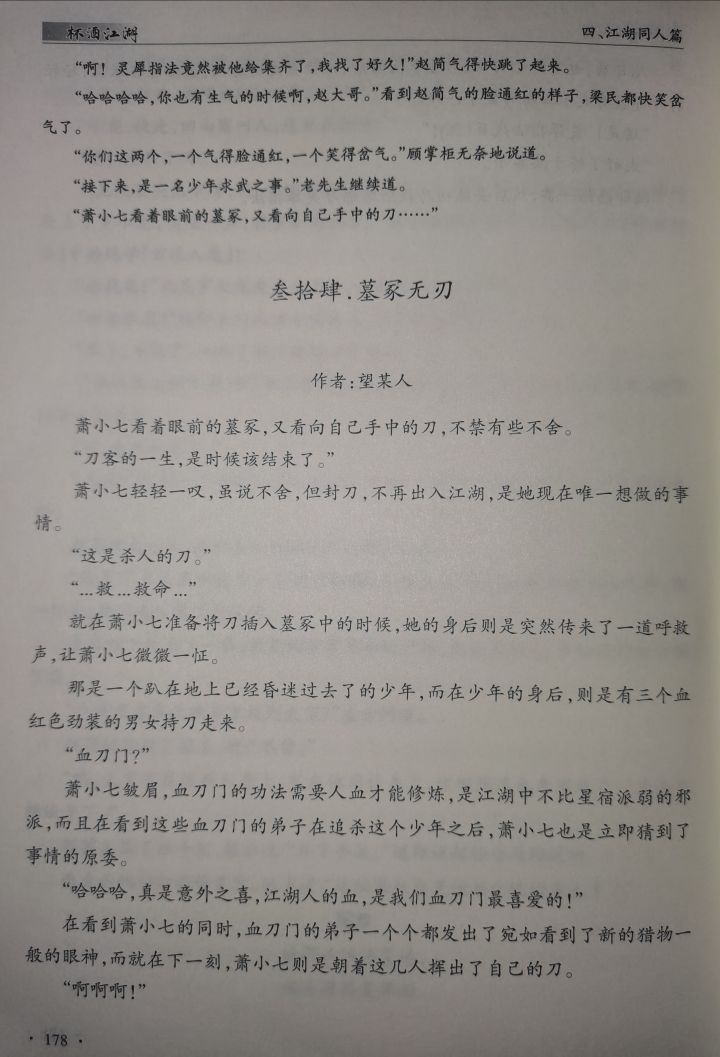 《杯酒江湖》是小猴官方出的一本书,目前暂无购买途径,我这本是之前放置江湖微信公众号新年活动获得的奖励。里面的故事有些是小猴认可的,可以说是补剧情坑的,有些是同人创作的精彩故事。有小伙伴跟我说之前那个分享帖图片太多,会导致页面卡死,而且放一起不好浏览,所以我打算整理一下,发多个帖子,然后用一个帖子当目录,这样就能方便浏览阅读了(*σ´∀`)σ目录:一、江湖故人篇。二、江湖轶闻录。三、江湖