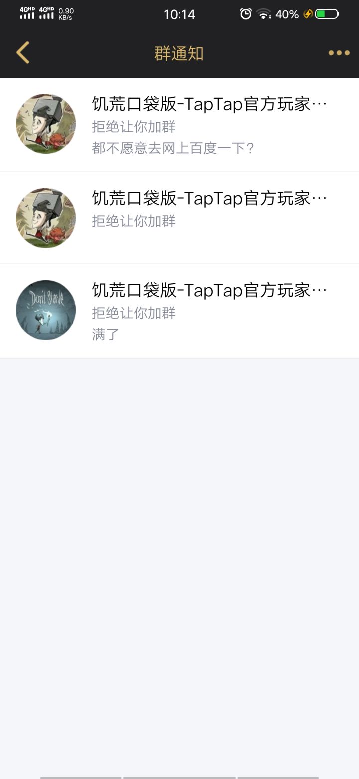 原先只在pc端玩过游戏,今天无意间想起来饥荒想来玩一下,但是为什么不让进群,就算是我答案说错了,我也去百度了一下也回答了,为什么还是不让进?这是不让人玩还是怎么回事?