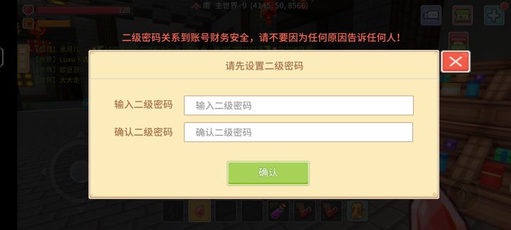 更新了中秋版本后,奶块登录是可以登录的进去,但是,进入游戏后,打不开背包,会不断的跳出设置二级密码我之前已经设置过了的,现在无论怎么弄,输入之前的二级密码还是输入重新想好的二级密码,都会跳出一个设置失败的界面,导致我无法打开背包背包都没法打开,怎么玩。。。