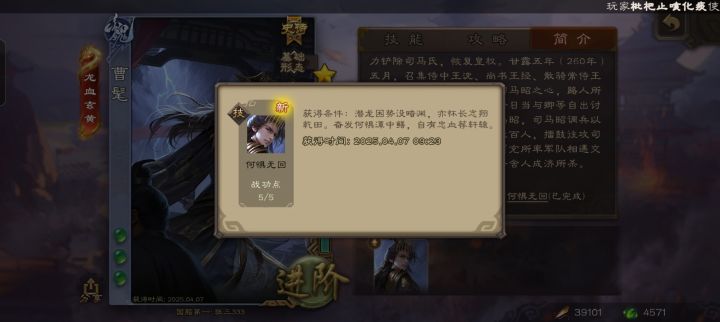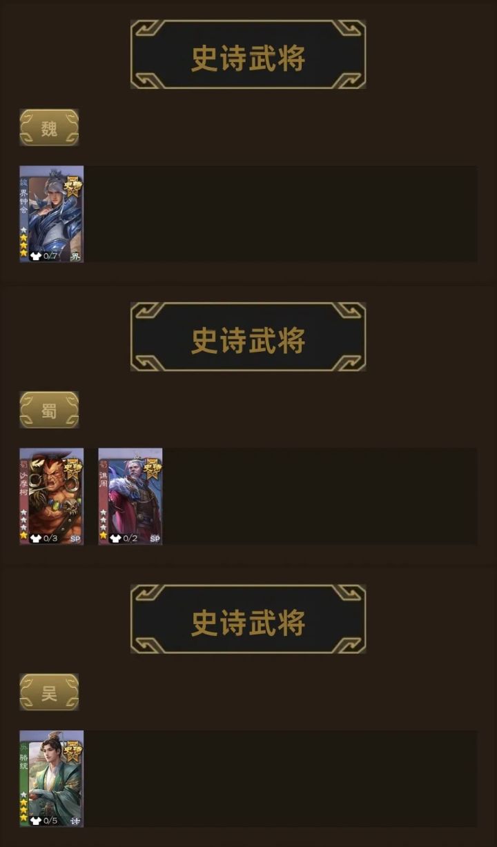 可以在军五自由场或人机演练获取魏1.谋曹丕(叉出去)对曹植或于禁使用放逐翻面2.曹髦(跟我冲)曹髦开大后李昭焦伯对曹髦使用技能3.谋夏侯惇(没眼看)使用清俭给两名角色各两张牌,或者每轮给一名不同角色两张牌或以上4.势董昭(大的要来了)对曹操使用迎驾5.清河公主(去你的)受到伤害时,发动诽离移除诬标记,累计对三名角色移除蜀6.谋诸葛亮(卧龙出山)刘备仁德三张牌7.谋刘备