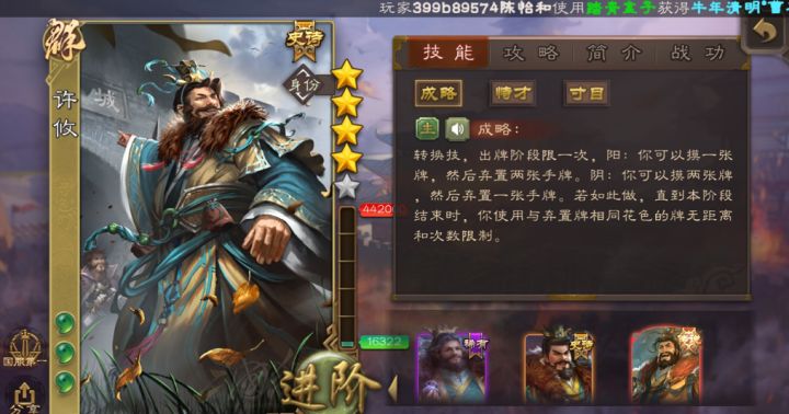 一、技能剖析【成略】:阴阳技。阳:摸一弃二(手牌不健康,别用)阴:摸二弃一(爆发)简单的说,一轮只能发动一种,交替使用。也可不发动。一般来说阴为爆发回合。【恃才】:补牌/过牌技。也是核心技能。需注意的一点是“使用”。所以南、万、决斗这种打出的方式都不能触发技能!并且何太后回合开始时鸩毒使用的酒是虚拟的也不能触发技能。一生之敌:曹阿瞒的神技【奸雄】发动时机优先于恃才,所以发动不了的。而回