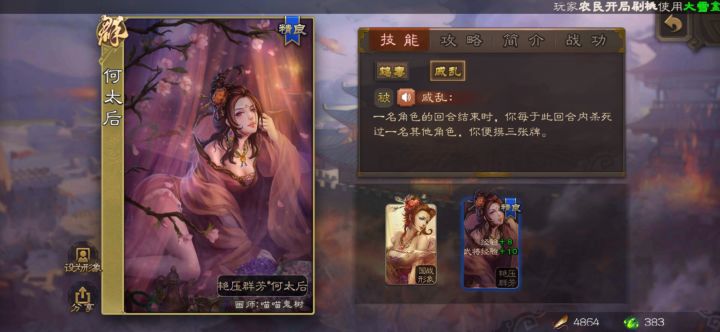 何太后戚乱是在当回合内每杀一名其他角色摸三张,但是国战何太后在自己回合内杀两个戚乱只摸了三张
