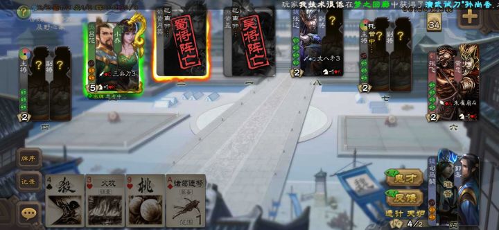 2.谏战:你与其他角色距离-X(X为你所装备的武器的攻击距离)。当你使用一张酒后,你可以视为使用一张杀。(此杀不计入次数)