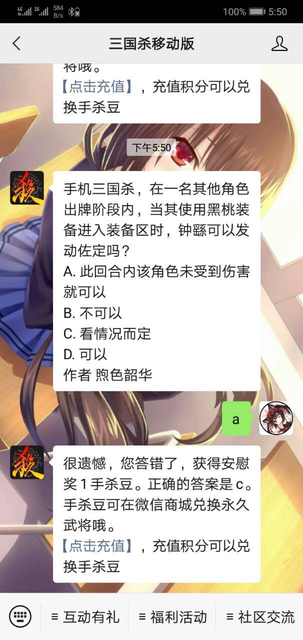 三国杀每日答题?