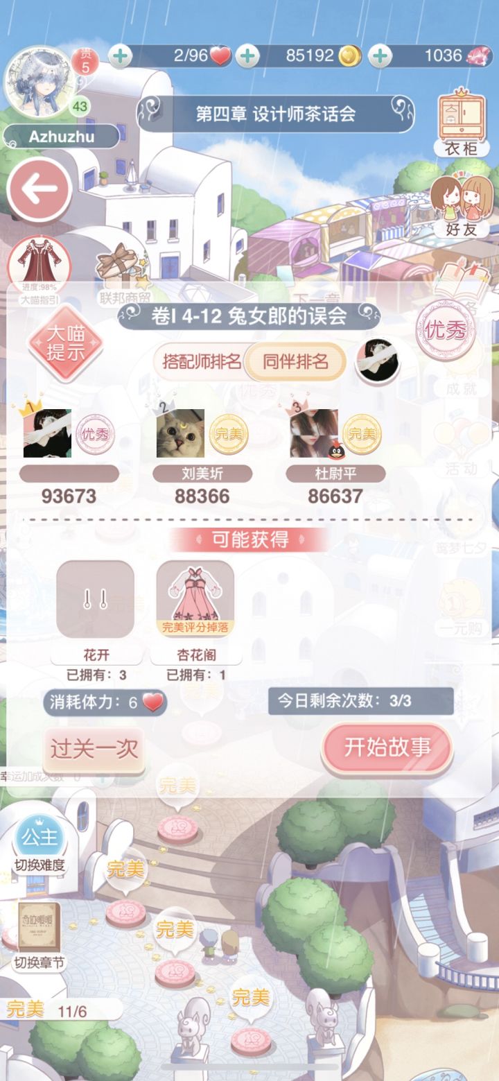 每隔一段时间都会刷一遍关卡,把没达到完美的刷上去,唯独兔女郎怎么也不能完美,按照局内的大喵完美提示也不行,好着急呀5555555555太稀有或者古早时期的衣服我也没有,因为这个号是半年前开始玩的,现在只充到贵5。有没有这一关完美通过的姐妹可以救救我T_T
